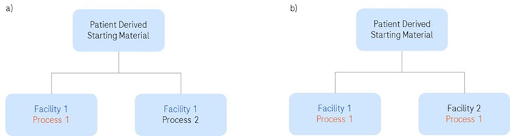 Figure 1: Examples of split manufacturing examples to demonstrate comparability from patient-specific starting material: a) new process implemented in one manufacturing facility; b) same process implemented into two manufacturing facilities.