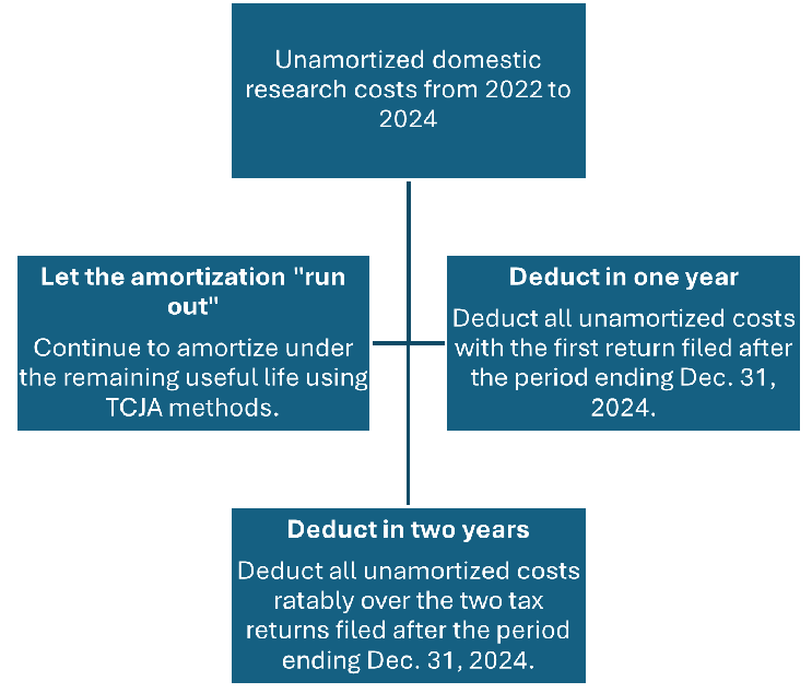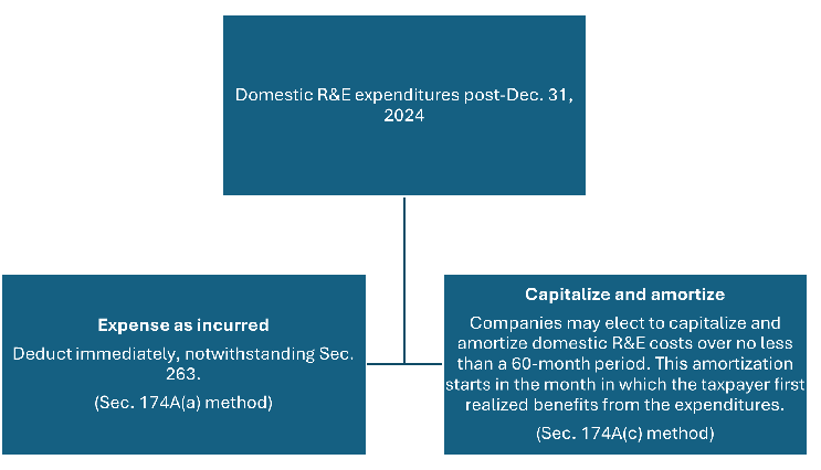 Under new tax provisions enacted through the One Big Beautiful Bill Act (OBBBA), companies have two options for how to treat domestic research expenditures incurred in tax years beginning after Dec. 31, 2024.
