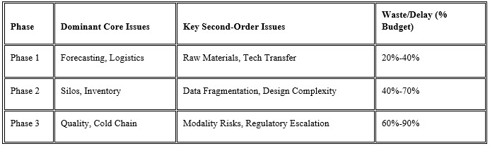 Data fragmentation across unstructured sources hampers analytics, QP releases, and predictive planning, while ad hoc risk management without formal FMEA or Supply Chain Operations Reference (SCOR) models leaves firms reactive. Lean teams suffer expertise gaps in GxP nuances, often missing trial design flaws like overly complex visit schedules that strain supply. Trial complexities such as adaptive protocols, frequent amendments, decentralized models, comparator sourcing, and co-medications introduce labeling, blinding, and custody intricacies. Novel modalities like ADCs and cell/gene therapies multiply manufacturing sites and process windows, elevating failure rates. Organizationally, investor pressure fosters milestone myopia — prioritizing speed over robustness — and treats supply as tactical rather than strategic, lacking dedicated ownership. Global escalation in requirements like GS1 serialization and data integrity further strains capacities.2,5,7,9,10,11,12,16,17