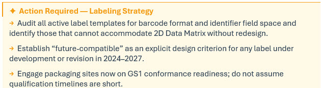 Clinical labeling gets treated as a technical execution function. It is actually one of the highest-leverage decision points in the entire life cycle. Global trials require coordination across languages, regulatory jurisdictions, packaging sites, and quality systems. Once a label design is established and validated, changing it is not a quick exercise — the timelines alone make late-stage redesign genuinely painful. The NDC-12 rule also updates barcode requirements, permitting both linear and nonlinear formats — including 2D Data Matrix barcodes — provided they conform to internationally recognized standards such as those developed by GS1.1 Critically, for products subject to both NDC labeling and DSCSA product identifier requirements, a single 2D data matrix barcode may satisfy both beginning March 7, 2033.7 What looks like a compliance formatting update is, in practice, the moment where physical product packaging and digital data architecture either align or don’t.