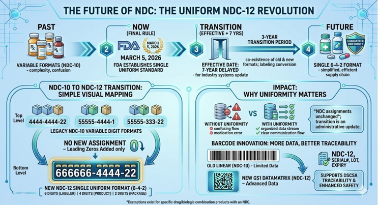 - Faegre Drinker Biddle & Reath LLP. (2026, March). FDA finalizes rule requiring 12-digit National Drug Code (NDC). https://www.faegredrinker.com/en/insights/publications/2026/3/fda-finalizes-rule-requiring-12-digit-national-drug-code-ndc