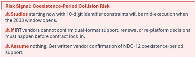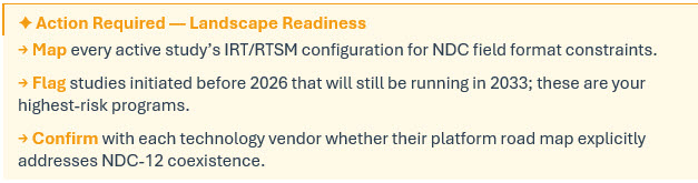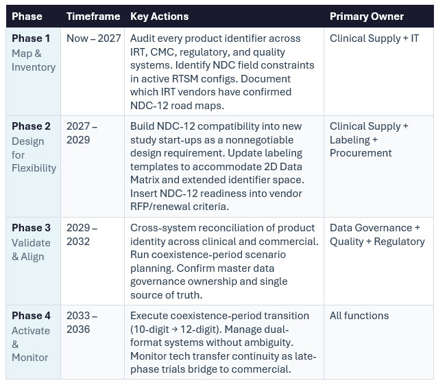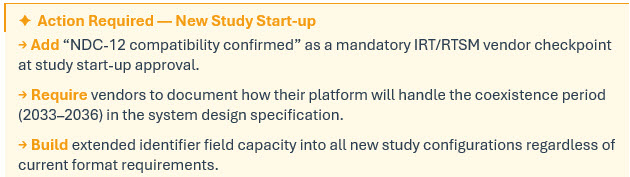 A trial initiated today will likely still be running when that window opens. Its IRT system was configured at study start-up with product identifiers that map to the 10-digit structure. Manufacturing scale-up is proceeding with commercial CMOs that are already moving toward NDC-12 in their own systems. When the product approaches approval, the commercial identifier will have shifted, while clinical systems still reference the earlier format.